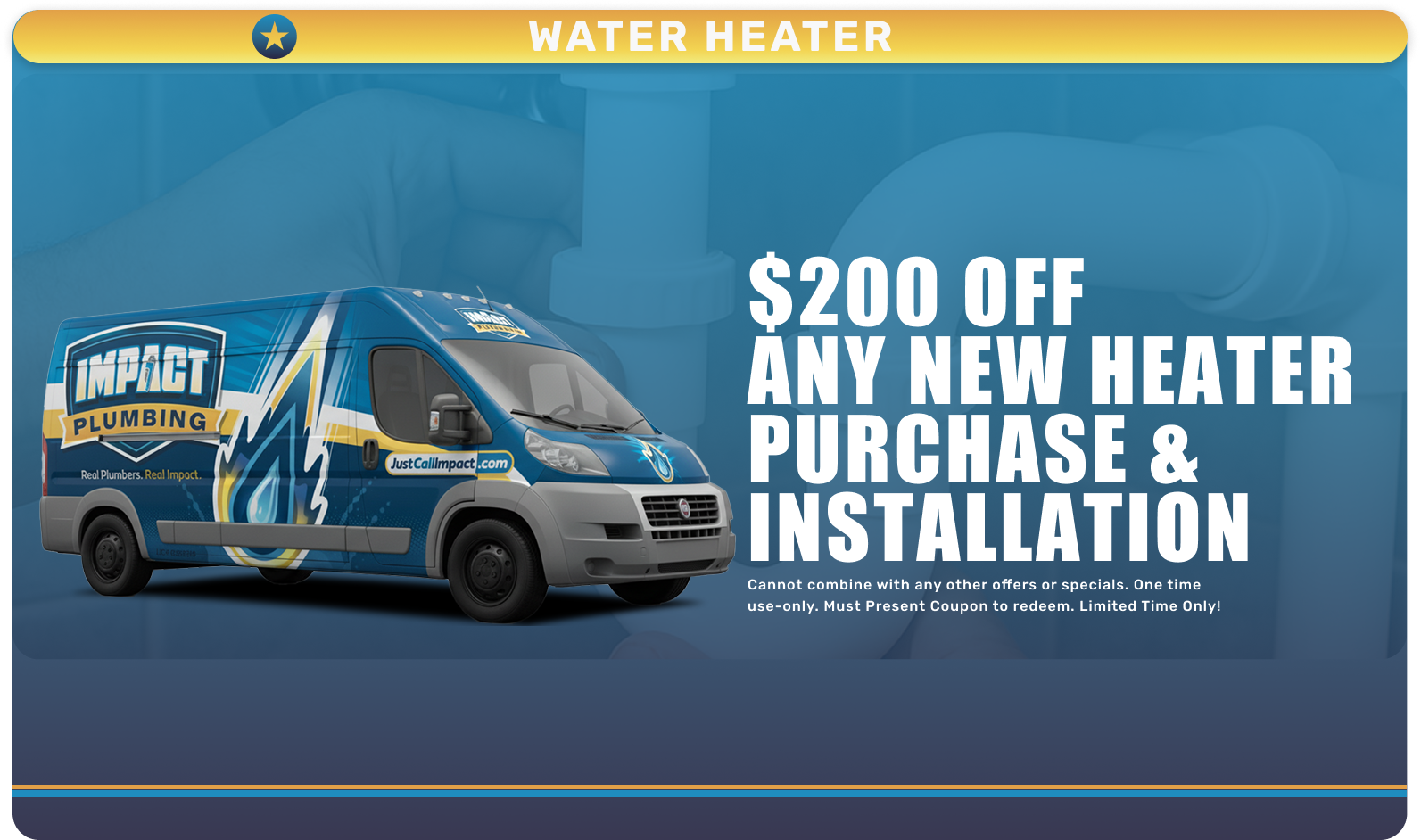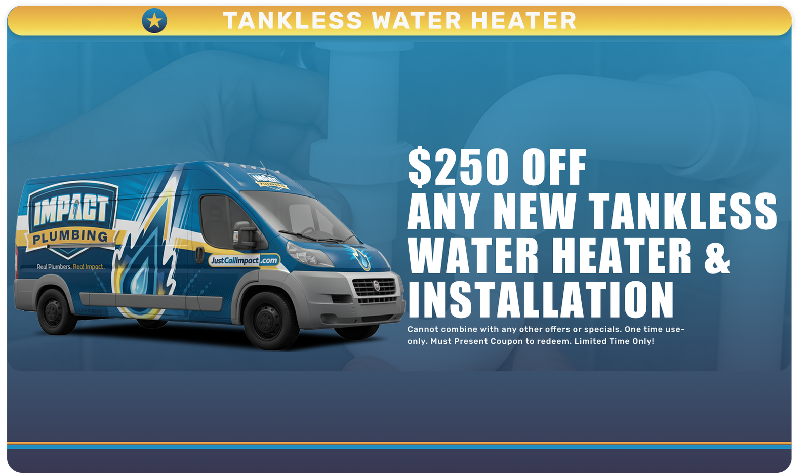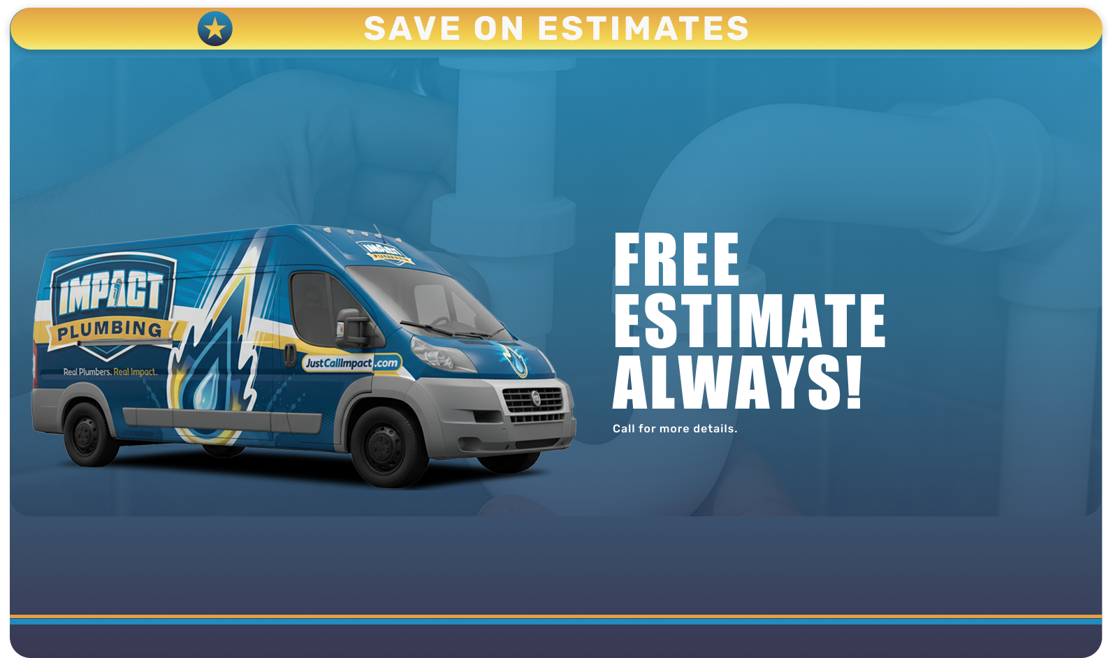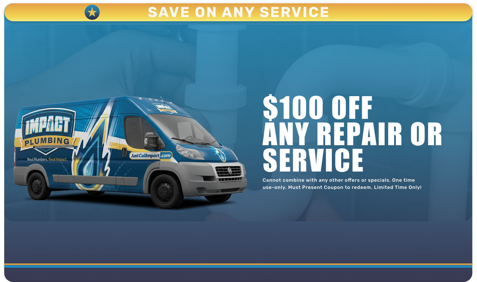 Ready to save on your next plumbing service? Fill out the form below or call Impact Plumbing to learn more about our current specials and promotions. Our team will apply the best available offer to your service.
